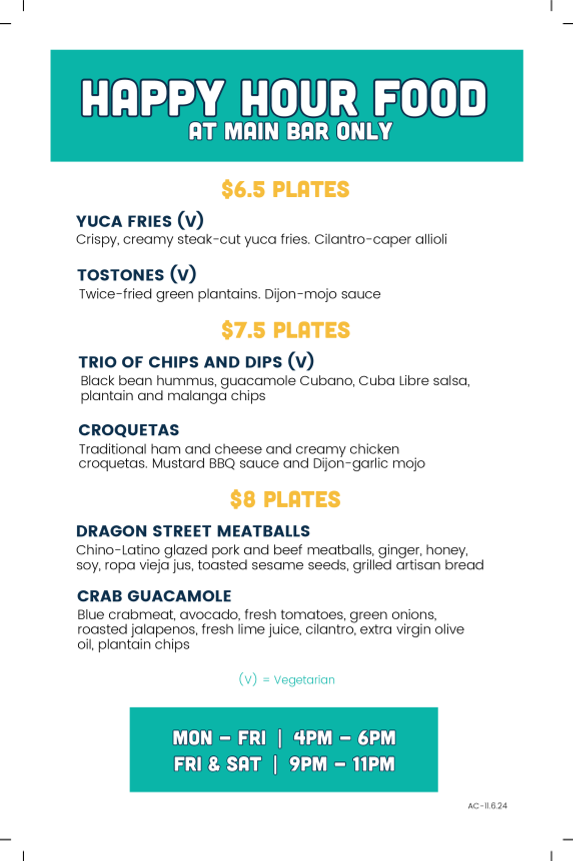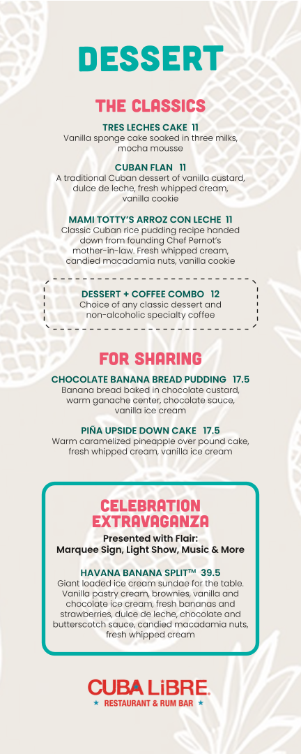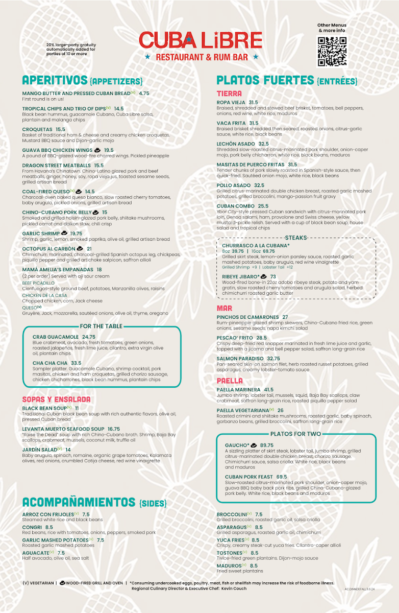 Don’t miss the Cuban classics, including tostones fried to perfection and pollo asado drizzled with a tangy mango-passion fruit gravy. End your meal on a sweet note with their legendary tres leches cake or Cuban flan, which is sure to satisfy your dessert cravings. Each dish is masterfully crafted, reflecting the passion of Chef Pernot's culinary heritage. With warm service and an inviting atmosphere, Cuba Libre is not just a meal; it’s an experience.